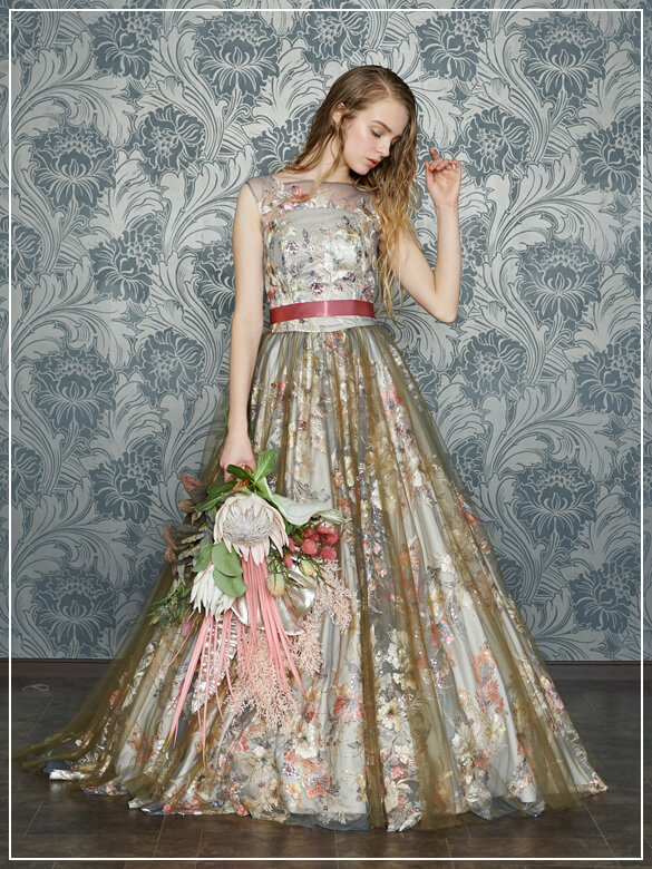 刺繍レースで彩る人気のアースカラー。サッシュベルト等で2WAYアレンジカラードレス。
